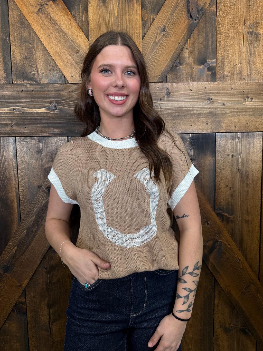Beige Horse Shoe Contrast Trim Short Sleeve Sweater Top